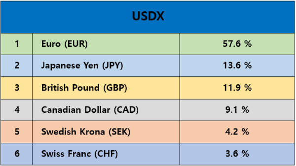 우리는 통화쌍을 거래하는 트레이더들도 반드시 참고해야 할 지표가 달러 인덱스(USDX)입니다. 통화에서 가장 중요한 수용과 공급 그리고 금리 정책이 가장 잘 반영되는 것이 달러 인덱스이기 때문입니다. 물론 일정한 가중치를 주어 6개국의 통화로 구성된 바스켓을 가지고 있는 달러 지수가 완벽하게 달러의 강약이나 시장의 심리를 반영하고 있다고는 할 수 없으나 현재까지는 가장 신뢰하고 대부분의 사람들이 참고하고 있다는 점에서 늘 참고할 필요가 있습니다.