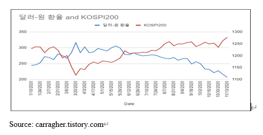 2020년 11월에 환율은 1100원대로 하락했으나 코스피 200은 340대까지 지속적으로 상승하고 있다. 원칙대로라면 환율 하락으로 인한 기업의 수출이 감소하고 주가는 하락해야 함에도 주가가 여전히 엄청난 상승세를 보이고 있다.
