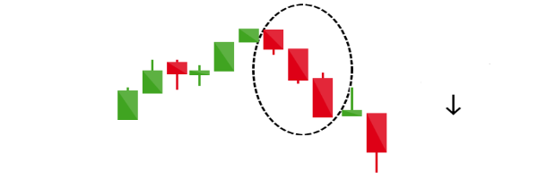이러한 패턴은 약세 하락으로 시장이 전환하는 것을 의미하는 것뿐 아니라 그 하락이 상당히 클 수 있다는 시그널을 줍니다. 매도자들이 3 거래일 연속 확실한 매도 우위를 보여주기 때문에 상당한 시장의 변화가 시작되었다고 볼 수 있는 것입니다.