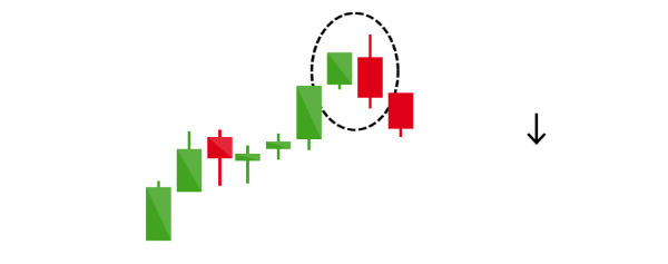 첫 번째 캔들은 짧은 몸체를 가지고 있는 양봉을 가지고 있으며 다음의 빨간 캔들은 긴 음봉을 가지고 있어야 합니다. 그리고 이 두 번째의 캔들은 첫 번째 짧은 양봉을 완전히 장악하고 있어야 합니다. 이것은 가격이 최고점에 다달았아다가 점차 감소하고 있으며 이는 가격이 하락 전환할 수 있는 의미 있는 징조가 될 수 있습니다. 이때 두 번째 큰 음봉의 캔들이 더 아래로 내려올수록 가격 전환의 확률은 더더욱 강해지는 징조가 될 수 있습니다.
