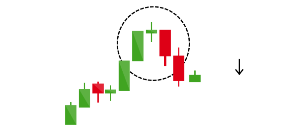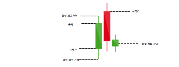 전날의 상당한 매수 우위의 시장의 모습을 볼 수 있습니다. 세 개의 캔들 중에 첫 번째 것은 가장 높은 가격을 찍은 후에 그날 가격을 마무리 짓게 됩니다. 두번째은 캔들은 시작가가 전일 종가보다 더 높은 가격에서 시작하며 상당한 상승 추세를 보일 것 같았지만 상당히 하락하며 긴 음봉을 만들었다. 종가는 전일의 양봉 캔들 몸체의 중간 이하에서 마무리되었다. 캔들은 비록 양봉이긴 하나 종가가 전날의 긴 하락 음봉의 종가 아래에서 마무리함으로 시장이 하락 전환하였음 확인시켜주는 역할을 하게 됩니다.